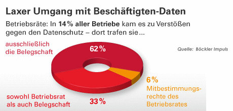 Der WSI gab in einer Studie bekannt, dass jedes siebte Unternehmen, etwa 14 Prozent, gegen die Vorschriften des Datenschutzes verstößt. Was das für die Beschäftigten heißt ist klar: Daten wie Krankentage oder anderweitige Daten werden unerlaubt gespeichert. Und es kommt noch schlimmer. Viele Daten werden für rechtswidrige Nachforschungen eingesetzt. Betroffen sind nicht nur Großbetriebe, sondern auch mittelständige Unternehmen sowie Kleinbetriebe.