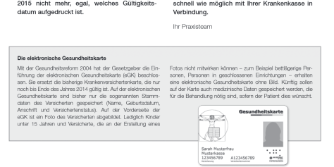 Wenn man medizinische Leistungen in Anspruch nehmen will, muss man seit diesem Jahr die elektronische Gesundheitskarte vorlegen. Nur sie wird als Versicherungsnachweis anerkannt, so wurde es in der Gesundheitsreform 2004 festgelegt. Die Gültigkeit der bisherigen Krankenversichertenkarte ist Ende 2014 abgelaufen.